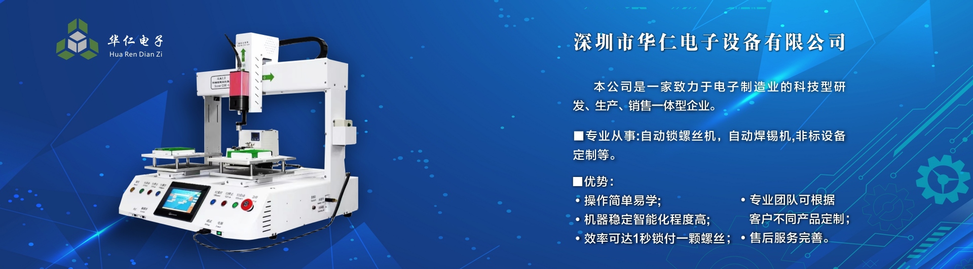 深圳市華仁電子設(shè)備有限公司是一家致力于電子制造業(yè)周邊設(shè)備的科技型研發(fā)、生產(chǎn)、銷(xiāo)售一體的企業(yè),專(zhuān)業(yè)從事:自動(dòng)鎖螺絲機(jī);自動(dòng)焊錫機(jī);非標(biāo)設(shè)備定制機(jī)等,公司長(zhǎng)期以來(lái)在行業(yè)中積累了豐富的經(jīng)驗(yàn),擁有專(zhuān)業(yè)的研發(fā)、技術(shù)、銷(xiāo)售支持工程團(tuán)隊(duì)、各高級(jí)技術(shù)人才為客戶(hù)提供優(yōu)質(zhì)產(chǎn)品和服務(wù),同時(shí)不斷吸取國(guó)內(nèi)外先進(jìn)技術(shù),更準(zhǔn)確及時(shí)地為客戶(hù)提供優(yōu)質(zhì),性?xún)r(jià)比高的產(chǎn)品、公司以專(zhuān)業(yè)的售前、售中、售后服務(wù)贏得了客戶(hù)的信賴(lài)和好評(píng),為客戶(hù)提供先進(jìn)自動(dòng)化設(shè)備一體式解決方案、